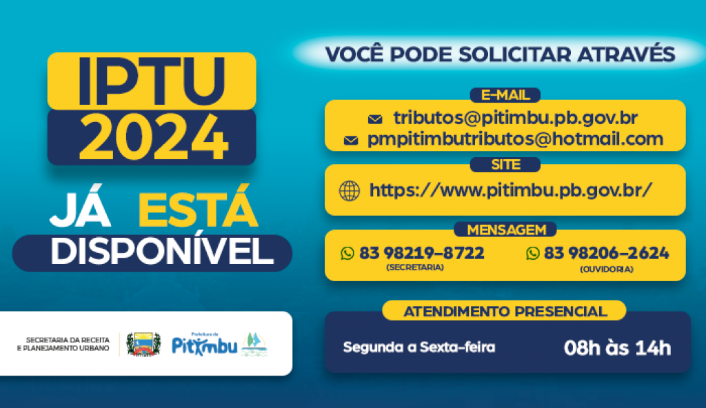A Prefeitura Municipal de Pitimbu, por meio da Secretaria da Receita e Planejamento Urbano, informa que o Imposto Predial e Territorial Urbano (IPTU) referente ao ano de 2024 já está disponível para pagamento, com destaque para o desconto de 20% para pagamento em cota única.