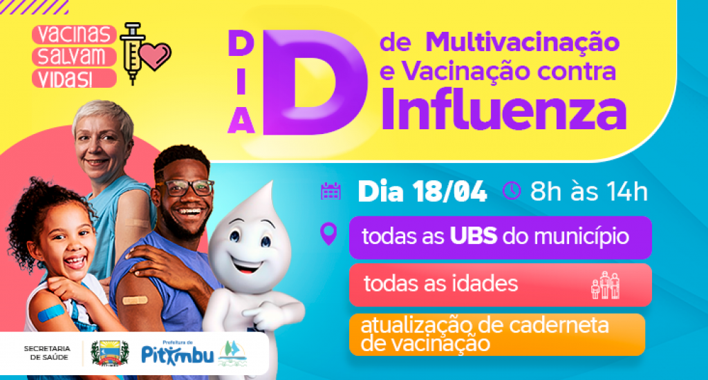 A Prefeitura Municipal de Pitimbu, por meio da Secretaria Municipal de Saúde, realizará mais um Dia D de multivacinação e vacinação contra a Influenza em todas as unidades de saúde do município, nesta quinta-feira (18), das 08h às 14h.A campanha visa a atualização do cartão de vacinação, abrangendo diversos grupos prioritários conforme diretrizes estabelecidas pelas autoridades de saúde.